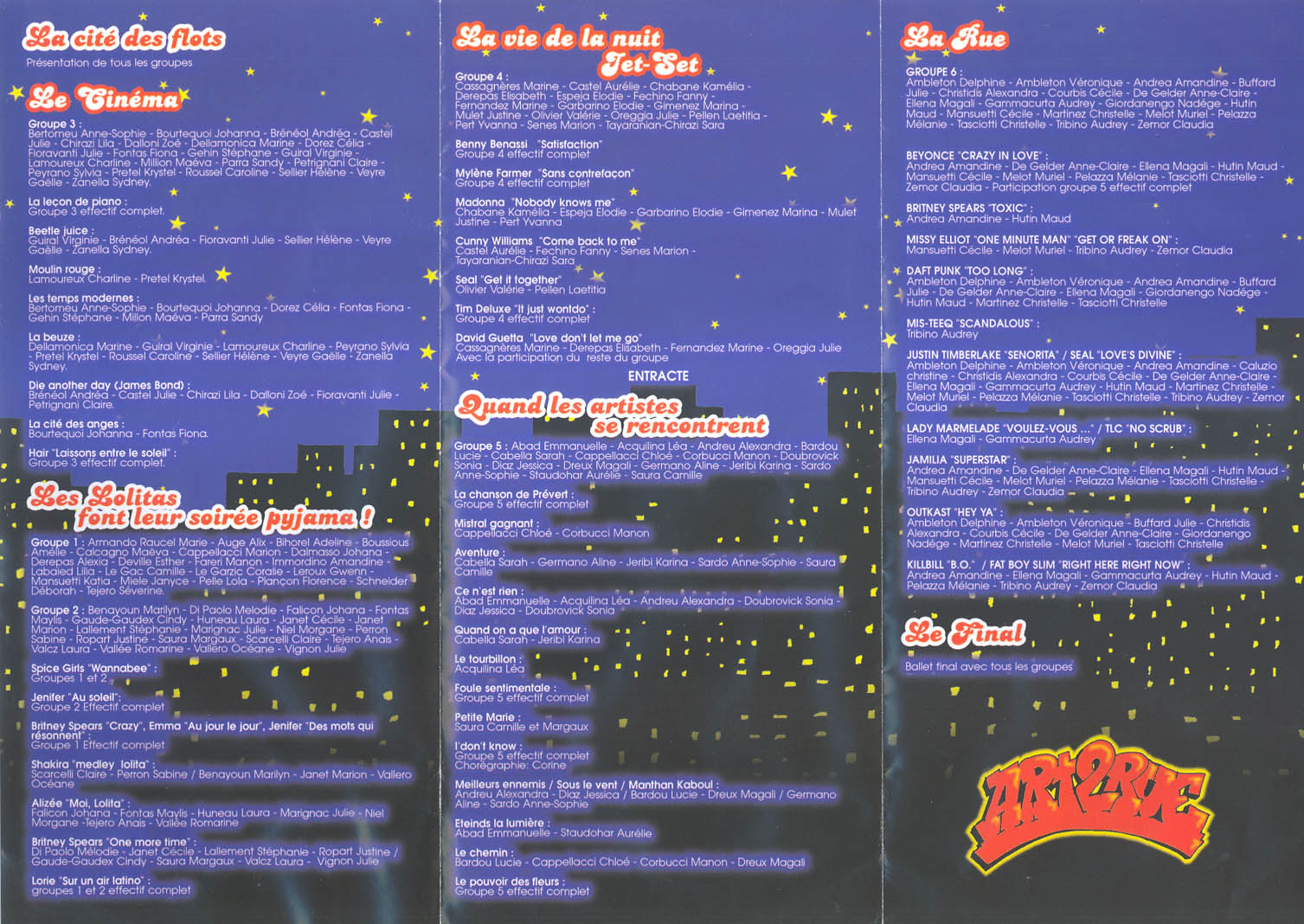 les 25 et 26 juin 2004 "Un soir à la cité des flots" La piscine des canebiers transformée en ville. Le groupe 3 à fait sa soirée cinéma, les lolitas des groupes 1 et 2 ont fait leur soirée pygama, le groupe 4 à fait la fête en boîte de nuit. Aprés l'entracte le groupe 5 nous a présenté des rencontres d'artistes et le groupe 6 l'art de rue! Les ballets de synchro étaient intercalés par l'intervention de Laurent et Delphine qui passaient leur soirée dans la même ville , des danseurs de Hip Hop ainsi que des danseuses! [ interieur du programme ] - [ dos du programme ] |